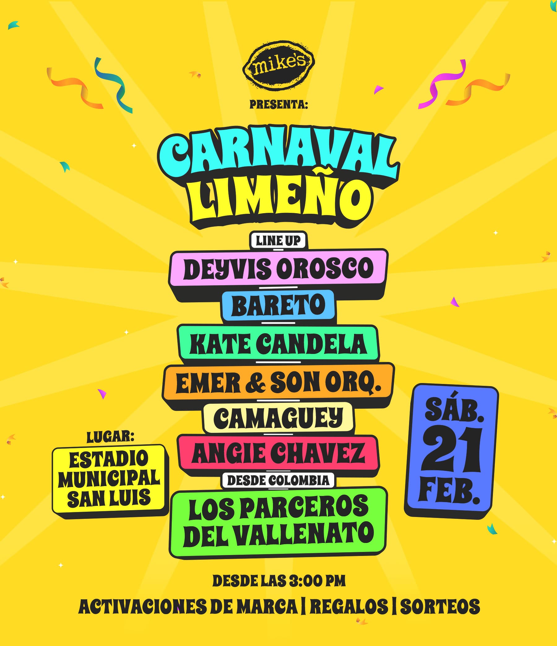 Una nueva edición del Carnaval Limeño, una de las celebraciones mas esperadas del verano en Lima, llega al distrito de San Luis este sábado 21 de febrero desde las 3 de la tarde en el Estadio Municipal (Av. Domingo Nieto 288). Será una jornada llena de música, color y todos los condimentos de un carnaval, acompañada de activaciones de marca, regalos y sorteos para el público asistente. La cartelera reúne a grandes exponentes como Deyvis Orosco, Bareto, Kate Candela, Emer y Son Orquesta, Camaguey, Angie Chávez y, directamente desde Colombia, Los Parceros del Vallenato, garantizando una experiencia vibrante y diversa.
