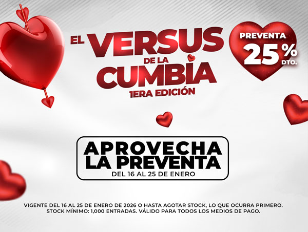 - * PREVENTA 20%: Vigente del 26 de enero al 01 de febrero de 2026 o hasta agotar stock, lo que ocurra primero. Stock mínimo: 1,000 entradas. Válido para todos los medios de pago.