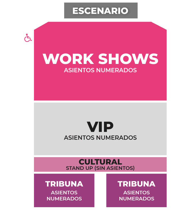 - * Las zonas Work Shows y Vip cuentan con asientos numerados; la zona Tribuna dispone de graderías numeradas; y la Entrada Cultural es en modalidad Stand Up, sin asientos.