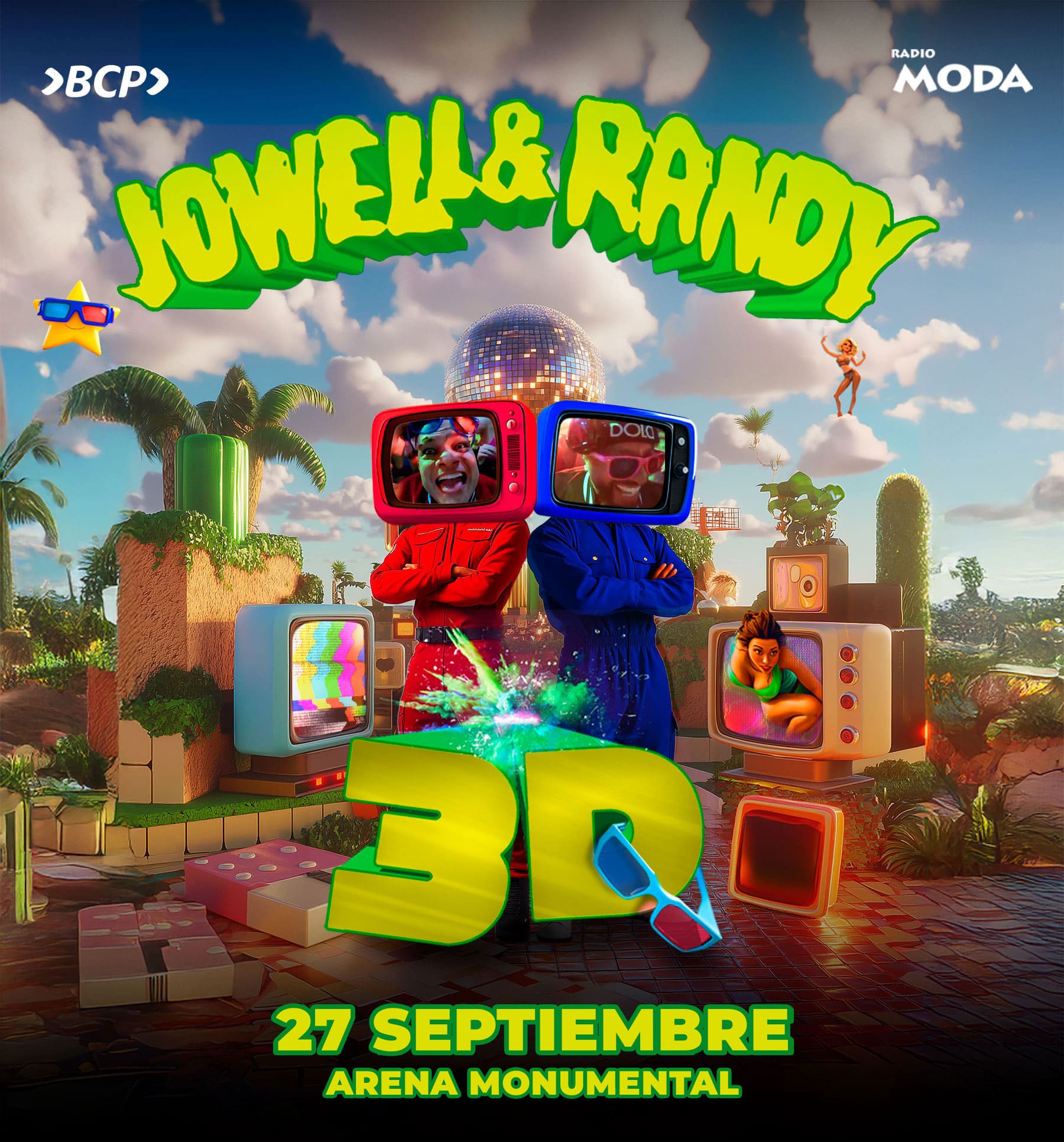 - * BCP 20% DTO.: Promoción válida a nivel nacional vigente del 14 al 18 de Julio del 2025 y/o hasta agotar stock de entradas. Descuento del 20% para el Concierto Jowell & Randy - Concierto 3D a desarrollarse el día 27 de Septiembre del 2025 en el Arena Monumental. Descuento válido en sólo para la compra de entradas en la web oficial de Teleticket (www.teleticket.com.pe) pagando únicamente con Tarjetas de Débito y/o Crédito BCP. Stock de entradas: General APDAYC: 785, Vip Alto: 234, Vip Bajo: 123, Platinum Lateral: 177, Platinum: 800, Viva el perreo: 250. No participan de la promoción los pagos de servicios (compra de entradas) realizados en viabcp.com, y/o a través de banca móvil. Descuento no acumulable ni válido con otras promociones. No participan las Tarjetas de Crédito BCP Empresariales, ni Tarjetas de Crédito iO, ni pagos con Yape. El BCP no se responsabilizará por la idoneidad del evento, ni por cualquier daño o perjuicio que pudiera derivarse del mismo. El desarrollo del evento es responsabilidad del organizador. El BCP no será responsable por cualquier eventualidad que impida la realización del evento o cualquier reclamo en general. El BCP podrá, previa comunicación a los participantes, modificar alguno de los términos establecidos en el presente texto, únicamente cuando dicho cambio no afecte la naturaleza de la Promoción. Para más información sobre la Promoción y/o restricciones, llama a nuestra Banca por Teléfono al (01) 311-9898 o ingresa a viabcp.com.